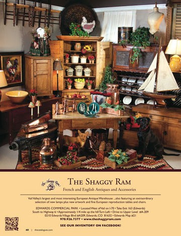 Furnish and accessorize your mountain cabin in style. The Shaggy Ram carries the finest French and English antiques and accessories. The fruitwood and pine antique furniture will add the perfect touch and will make any house feel like home. Browse the selection of hand crafted and hand painted armoires, dining tables, and chairs. Pick up a piece for your home that is truly one of a kind.